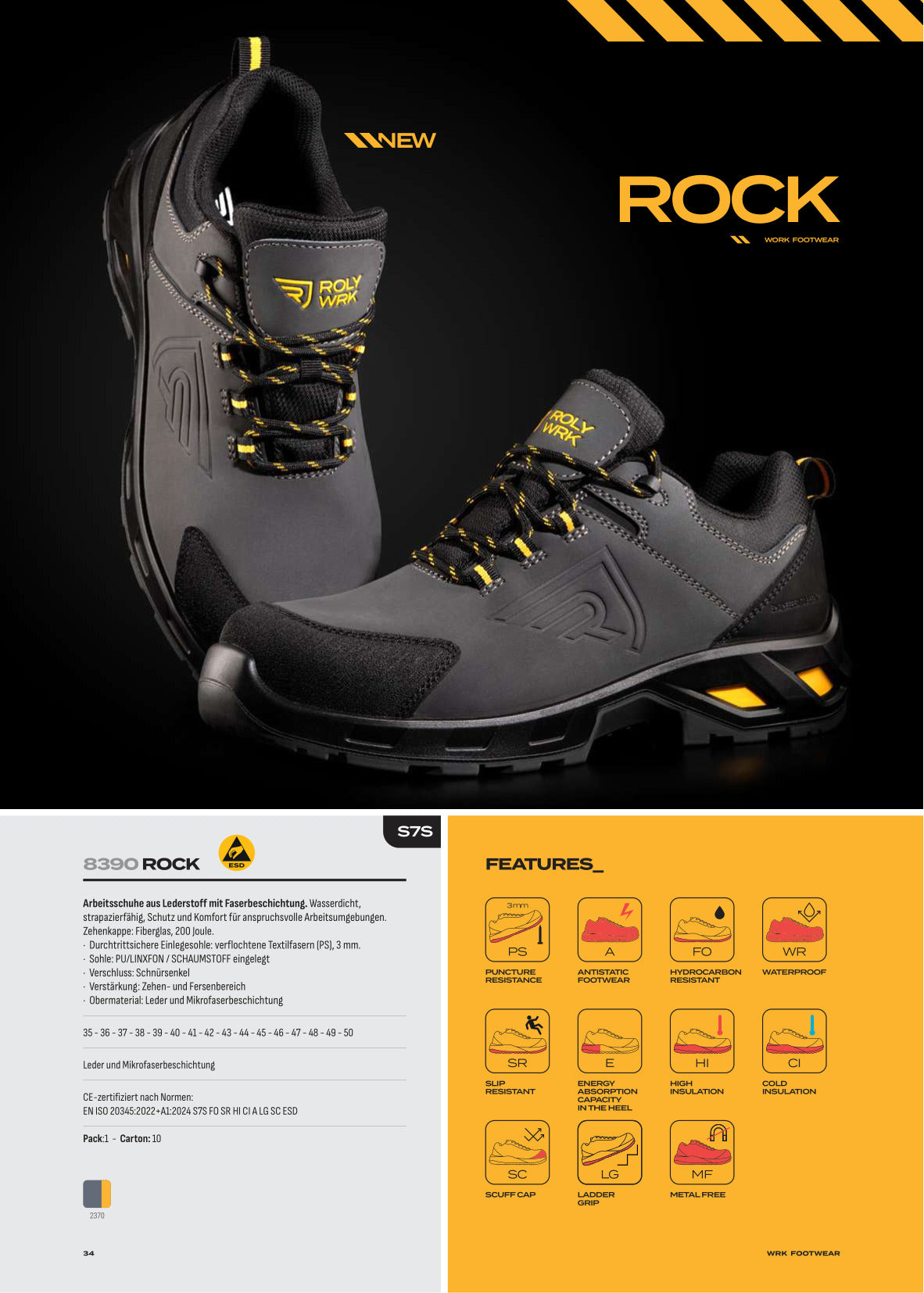 CE-zertifiziert nach Normen: EN ISO 20345:2022 + A1:2024 S7S FO SR HI CI SC LG + ESD Eigenschaften: